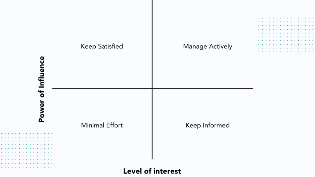 - High power – High interest: Likely to be decision makers and with high project impact. Manage these stakeholders’ expectations and work to encourage productive movement.